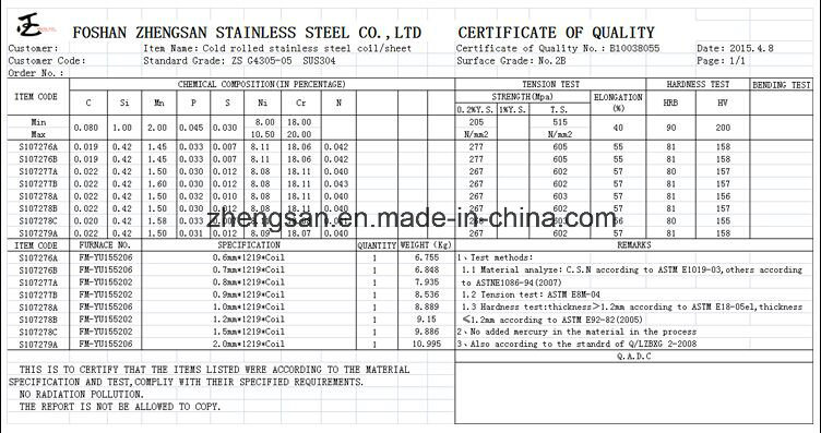 | 2B | Nachdem dem Kaltwalzen beendet durch die Wä Rmebehandlung, legend in Essig ein, gefolgt von der Hautdurchlaufzeile zur helleren und glatteren Oberflä Che | Medizinische Instrumente der allgemeinen Anwendung, Tableware. |